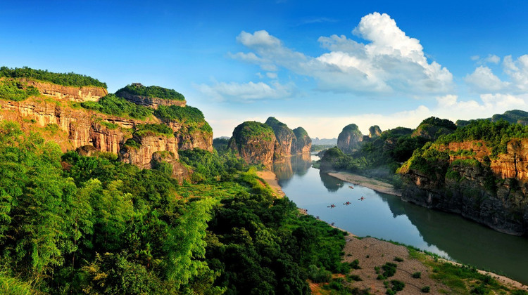龙虎山风景区位于鹰潭市郊,是道教发源地,道教创始人张道陵当年就是在此修炼得道的。龙虎山风景区的外貌和武夷山相似,都属于典型的丹霞地貌,是世界自然遗产。乘竹筏在泸溪河上看两岸的山景感觉非常棒,而古越人的崖墓悬棺、升棺表演也是很夺人眼球的看点。
