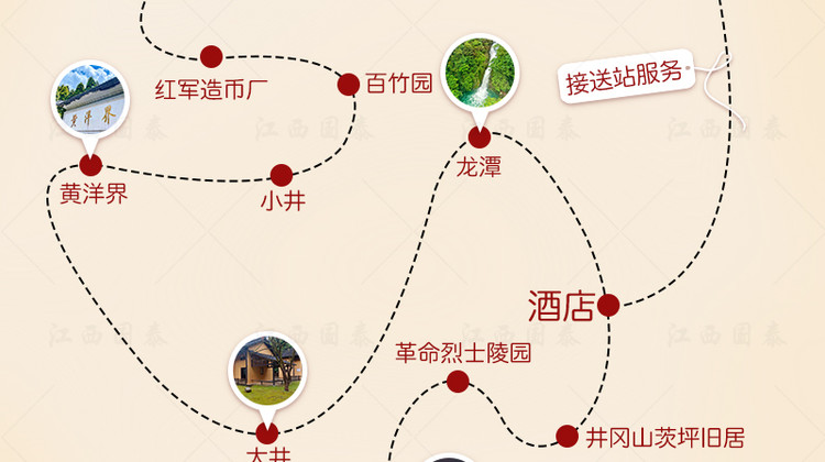 - 缤纷景点:重走红军路,井冈山的精华景点,红+绿双色景点相结合,感受不一样的革命情怀,不一样的红色之旅