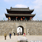 走过景区门口刻着“浮梁”二字的牌坊,只见开阔的广场上一条笔直的瓷板路直通前方的城门,远远看去很是壮观。低头看,你会发现地上长达几百米的瓷板上用图文介绍了浮梁和景德镇的悠久历史,包括城市的演变、陶瓷的发展史、重要任务和大事记等等。一路走来,不仅不会觉得闷,而且能对当地的历史文化有个大致的了解。登上城墙,从高处往下看,视野更是开阔。