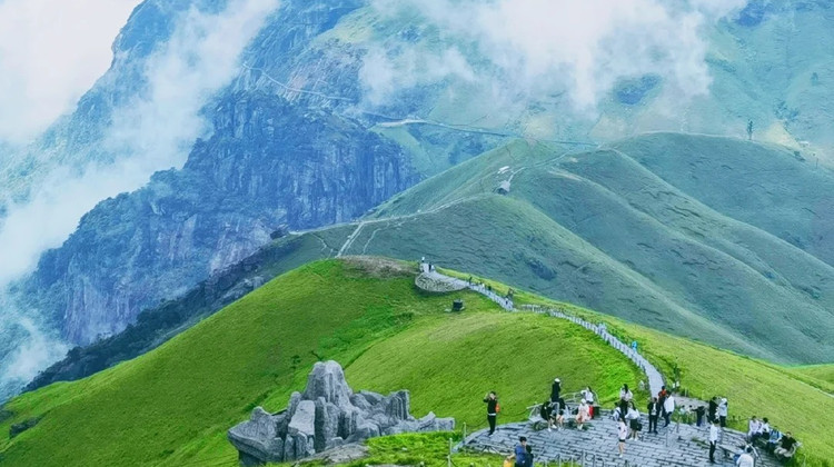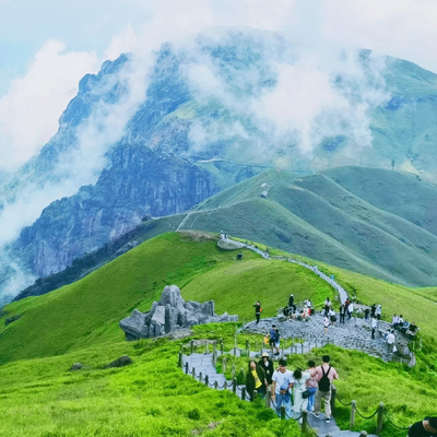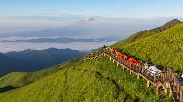 高山草甸是武功山景区的独特之处,其面积之广在世界同纬度名山中都是少有的。这里大规模的草甸绵绵于海拔1600多米的高山之巅,穿云入雾,真可谓“天上草原、人间仙境、北国风光、绿色家园”,令人向往。高山草甸从景色优美的发云界直至金顶高峰,连绵不断二十余公里,面积广阔。春季,鲜嫩的草芽破土而出,漫山遍野点缀着星星点点的野花,金红的云锦杜鹃、洁白的野蔷薇竞相绽放;盛夏时节,草甸犹如碧绿的海洋,清风拂过,草浪翻涌;秋日里,草甸逐渐染上金黄,与远处苍翠的山林、湛蓝的天空相映成趣;寒冬降临,皑皑白雪覆盖草甸,银装素裹间尽显苍茫大气。另外,高山草甸的日出也是让人震撼的,当红日从天边慢慢升起,起伏的山峦在晨曦的照耀下,犹如妖娆的身体曲线,婀娜多姿。