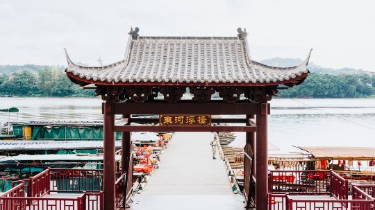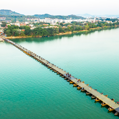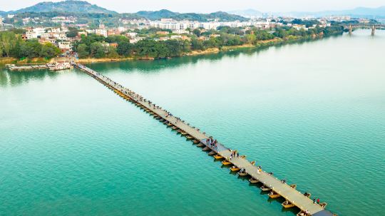 赣州古浮桥,学名叫惠民桥,又称东津桥、东河浮桥、建春门浮桥。浮桥长约400米,由100多只小舟板并束之以缆绳相连而成,始建于宋乾道年间(1163-1173年)、至今已有800多年历史。由知军洪迈所建,连接章江的两端,每天定时开启,以便来往商船通行。