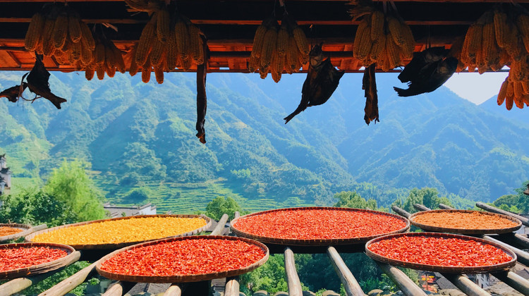 挂在山崖上的篁岭古村,地无三尺平,数百年来,村民早已习惯用平和的心态与崎岖的地形“交流”,绘就出了一处“晒秋人家”风情画。