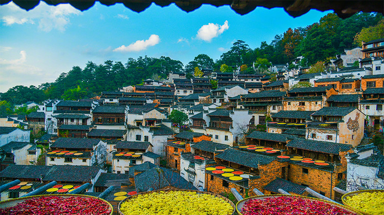 早餐后游览【篁岭景区】(自理往返缆车120元/人),徽式商铺林立,前店后坊,活脱脱一幅缩写版流动的“清明上河图”“篁岭晒秋”闻名遐迩:村民晒晾农作物使用竹匾晒在自家眺窗前木架上,形成特有的徽派民俗景观。四季花海展示惊艳的“大地艺术”。“地无三尺平”处处是花、是景。