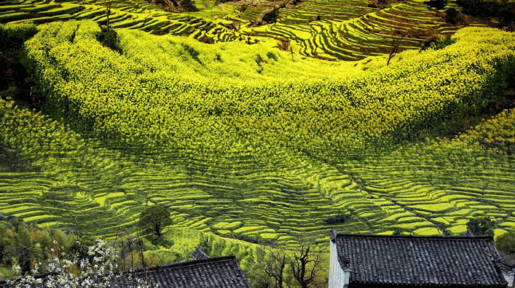 三月底,婺源篁岭景区二期高岭梯田花海接力上线,由于海拔落差大、温度低,加上晚熟油菜花品种,使得花期较晚,二期花海可持续至4月中旬。
