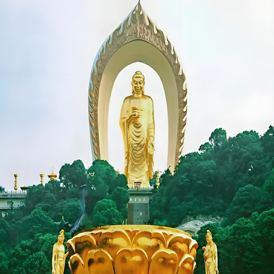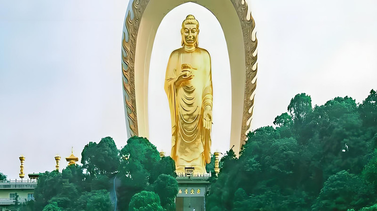 世界较高的阿弥陀佛铜像——48米高的东林大佛,这座金灿灿的大佛屹立在高山之巅,48米高的东林大佛整体造型吸收了龙门石窟等盛唐佛像优点,代表了当代较高水平的宗教艺术精品,中国少有的露天阿弥陀佛铜像。