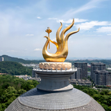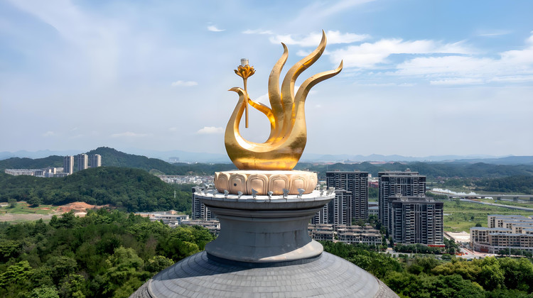 进入禅都文化博览园,首先映入眼帘的是象征“一花开五叶”之意的五叶空门。从空门处视线通达南北,充分展现禅的“空境”。入门处,2个莲池分布着7个巨大的花岗岩莲花石雕,意为佛祖释迦牟尼出生时“连走七步,步步生莲”。五叶坛为四层仿古建筑,走进大门便是高达6米的禅宗鼻祖达摩铜雕。第一层可赏读与禅宗28祖有关的文物、史经等;第二层则是宜春五百里禅宗历代名师展示馆;第三层为生活禅;第四层为管理功能区。整体建筑如佛祖如来座前的宝莲灯,意寓禅法传灯不灭。来到梵呗音乐厅。梵乐古朴庄严,清澈流畅,堪称慈悲与智慧的美丽绽放。在此,你可聆听古曲声、念佛声,体验参禅的意境,享受禅意生活,寻求心灵的宁静。