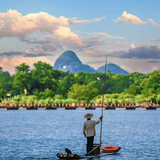 仙水岩的崖墓悬棺充满了神秘色彩,景区每天定时上演“升棺”表演(10:00-16:00,每2小时一场,供参考),演示将棺材固定到绝壁中的洞穴里的过程。游人在桃花洲岸边仰头观赏,表演则在对面的岩壁上进行,看起来十分惊险,又因为“升棺”与“升官”谐音,也有些人来此讨个好彩头。水面上停着竹排,升棺表演前约10分钟会表演展现古越人渔猎生活的“鸬鹚捕鱼”。