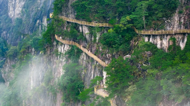 参观完紫极宫就要登顶了,可走左边的江西武功山国家级风景名胜区-吊马桩、中间的回音谷、右边的福星谷,吊马桩线是溯溪而上,经吊马桩栈道,爬好汉坡,直到山顶的高山草甸。步道比较陡峭,一路沿着悬崖绝壁、森林古木穿行,体力消耗非常大。回音谷是条老官道,有回音壁、雷打峡等景点。福星谷则是近几年专门为游客打造的上山路,由此步行到金顶大约1.5小时,若不愿走路还可以再坐一程索道,很人性化。通常选择悬索桥方向,由福星谷上,江西武功山国家级风景名胜区-吊马桩下。