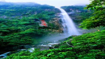 入口去索道下站会经过石鼓寺、武功山文化园,可花半小时简单参观。坐在索道上,往上看是奇峰陡崖和原始次生林,往下看是青翠的竹林、梯田,景色怡人。如果步行上山,沿途有尽心桥、尽心瀑、母子岩等景观。二者各有千秋,若不愿错过,可在次日下山时选择步行这一段。下索道便进入了福星谷区域,你会感到空气变得清新。索道站旁边的紫极宫也被叫做“中庵”,里面供奉着武功山王爷,据说这里求神问卦十分灵验。