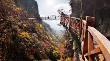 参观完紫极宫就要登顶了,可走左边的江西武功山国家级风景名胜区-吊马桩、中间的回音谷、右边的福星谷,吊马桩线是溯溪而上,经吊马桩栈道,爬好汉坡,直到山顶的高山草甸。步道比较陡峭,一路沿着悬崖绝壁、森林古木穿行,体力消耗非常大。回音谷是条老官道,有回音壁、雷打峡等景点。福星谷则是近几年专门为游客打造的上山路,由此步行到金顶大约1.5小时,若不愿走路还可以再坐一程索道,很人性化。通常选择悬索桥方向,由福星谷上,江西武功山国家级风景名胜区-吊马桩下。